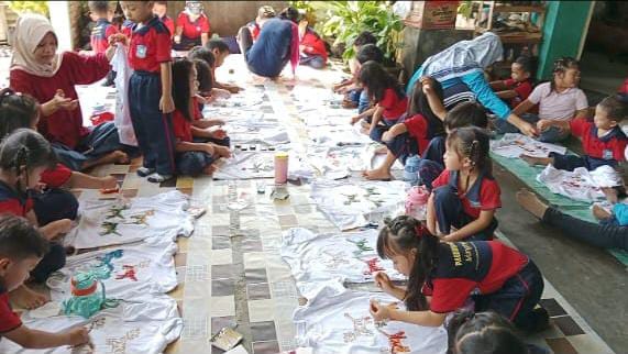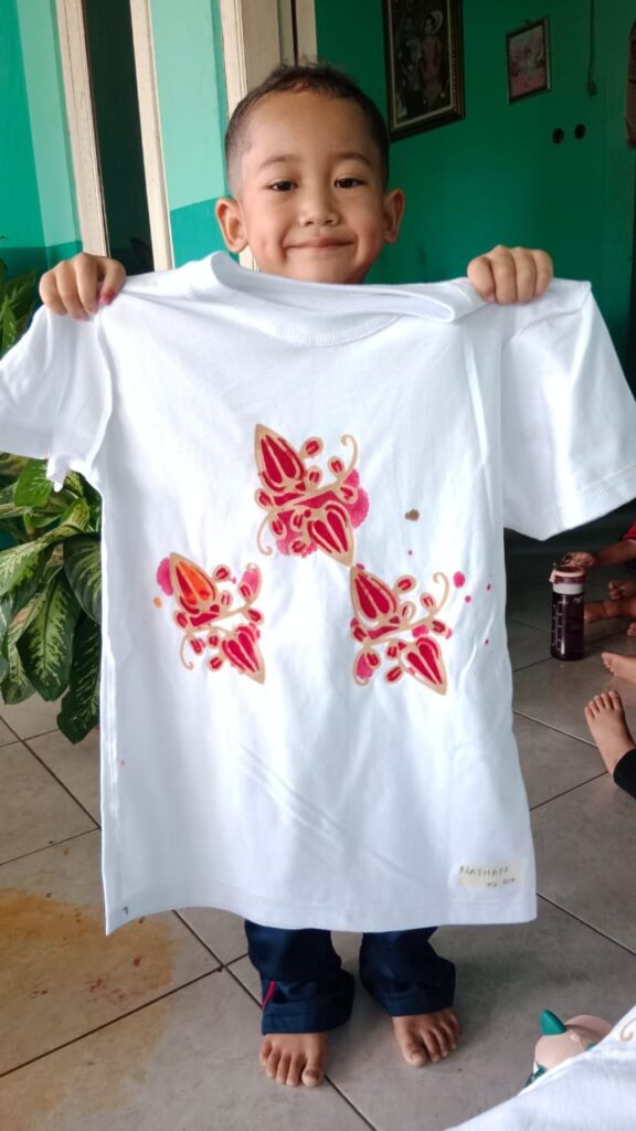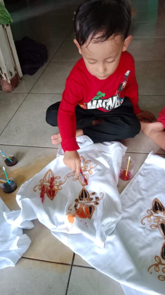 Dan sekarang sudah tiba di Rumah Batik Langse. Anak-anak akan membatik kaos putih yang sudah dicetak berbagai macam gambar. Ada gambar buah jambu, bunga, singa, dan lain-lain. Anak-anak mulai memabtik kaosnya menggunakan cat yang sudah disiapkan dengan cotton buds. Anak-anak boleh memilih warna cat yang disuka. Ada yang mewarnainya sampai penuh, ada yang mencorat-coret kaosnya. Dan akhirnya selesailah mmbatik kaosnya. Tapi kaosnya tidak bisa dibawa pulang dulu. Kaosnya akan di finishing sama pak Agus (pemilik Rumah Batik Langse) supaya hasilnya lebih bagus. Dan kaos putihnya akan diberi warna semua. Seminggu lagi kaosnya akan diantar ke sekolah dan siap dipakai. Selanjutnya anak-anak dikenalkan cara membatik yang sesungguhnya dengan menggunakan canting dan pewarna yang dimasak. Anak-anak bisa minta mau dibuatkan gambar apa, ada yang minta dibuatkan bunga, ikan, ayam, itik, spong bob, dan lain-lain. Tibalah waktunya anak-anak Kembali ke sekolah naik angkutan umum lagi. Kaos batik yang dibuat hari ini, akan dipakai pada tanggal 2 Oktober 2024 untuk memperingati Hari Batik Nasional.