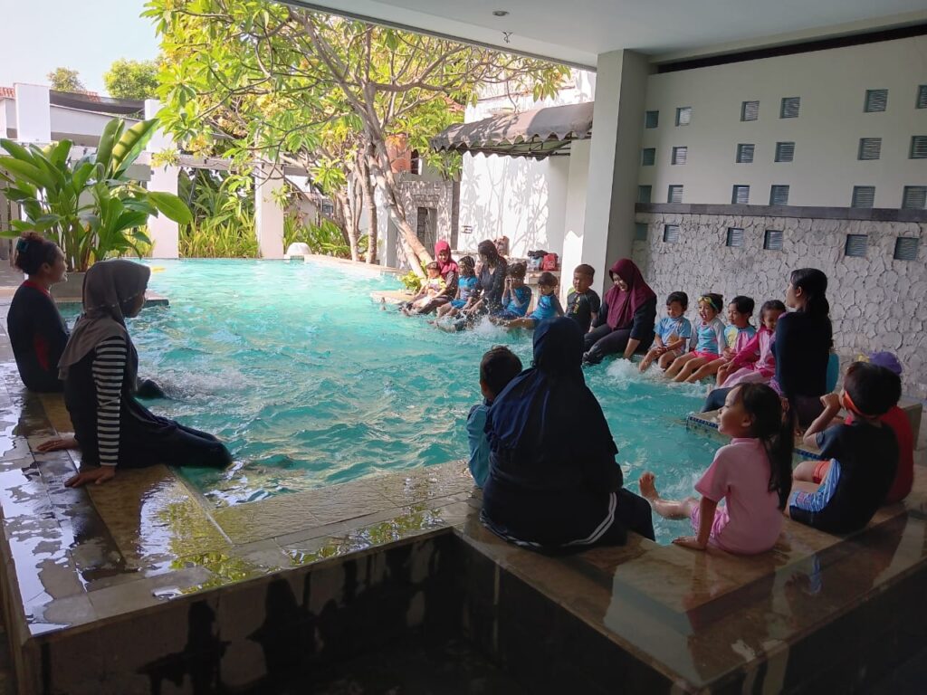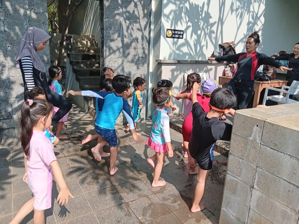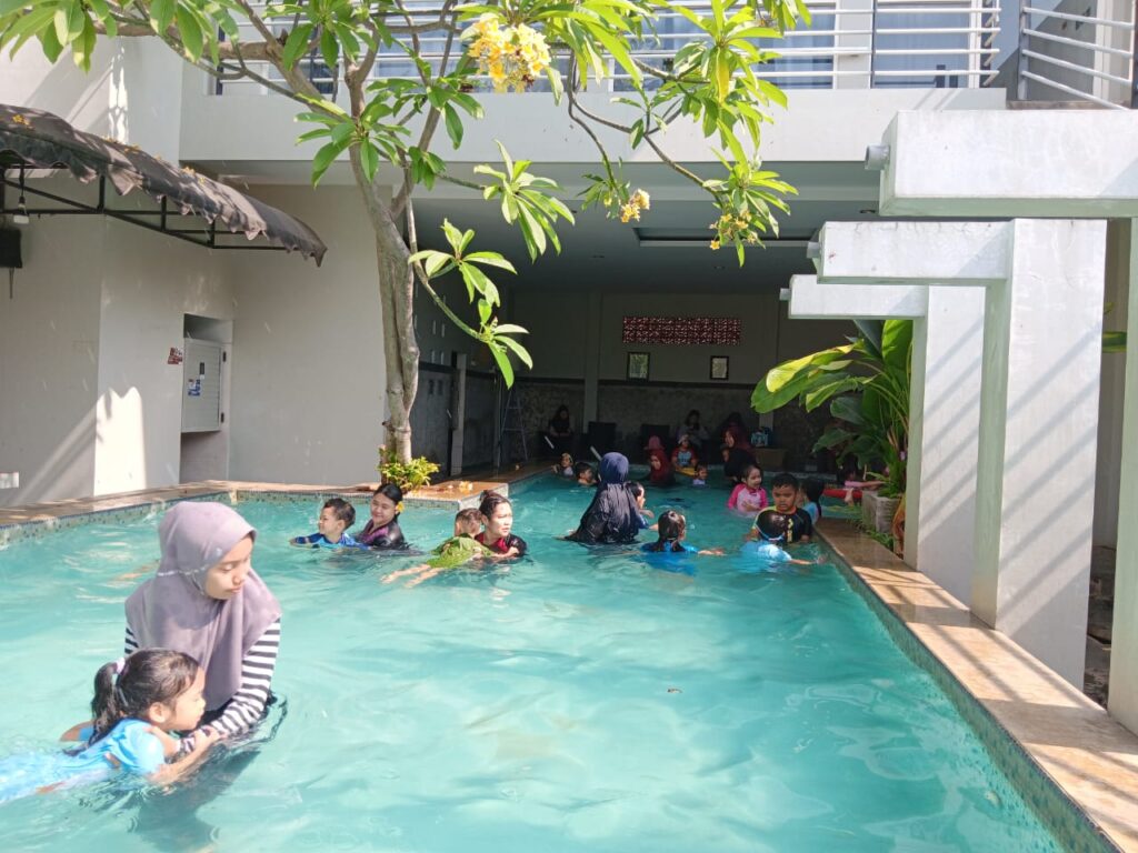Salah satu aspek yang dikembangkan di pendidikan anak usia dini adalah fisik motorik kasar. Saat ini anak-anak PAUD Bintang Kecil kegiatannya adalah berenang. Tempat berenangnya di Dona Doni. Untuk kegiatan renang agendanya sebulan sekali pada hari sabtu pekan pertama. Sebelum berenang kita akan pemanasan dulu. Gerakan pemanasan sebelum berenang adalah tahap yang tidak boleh dilewatkan. Pemanasan membantu mempersiapkan otot dan sendi tubuh untuk gerakan yang lebih intensif selama berenang. Ini dapat mengurangi risiko cedera otot atau kram. Tahap pemanasan berfungsi untuk meningkatkan aliran darah ke otot-otot yang bekerja saat berenang. Dengan peningkatan sirkulasi, otot-otot mendapatkan lebih banyak oksigen dan nutrisi yang diperlukan untuk berfungsi dengan baik sehingga tubuh tidak menjadi cepat lelah. Pemanasannya dipimpin oleh Bu Ana. Bu Ana adalah guru ekstra renang. Setelah pemanasan, kita diajak bu Ana duduk di pinggir kolam renang dan menggerak-gerakkan kaki di air. Selanjunya….. byurrrrr….. badan kita masuk di air…. Waktunya kita berenang….. Ada yang masih pakai pelampung dan ada yang tanpa pelampung. Bu Ana mengajari anak-anak berenang secara bergantian. Wah serunya bermain air…..