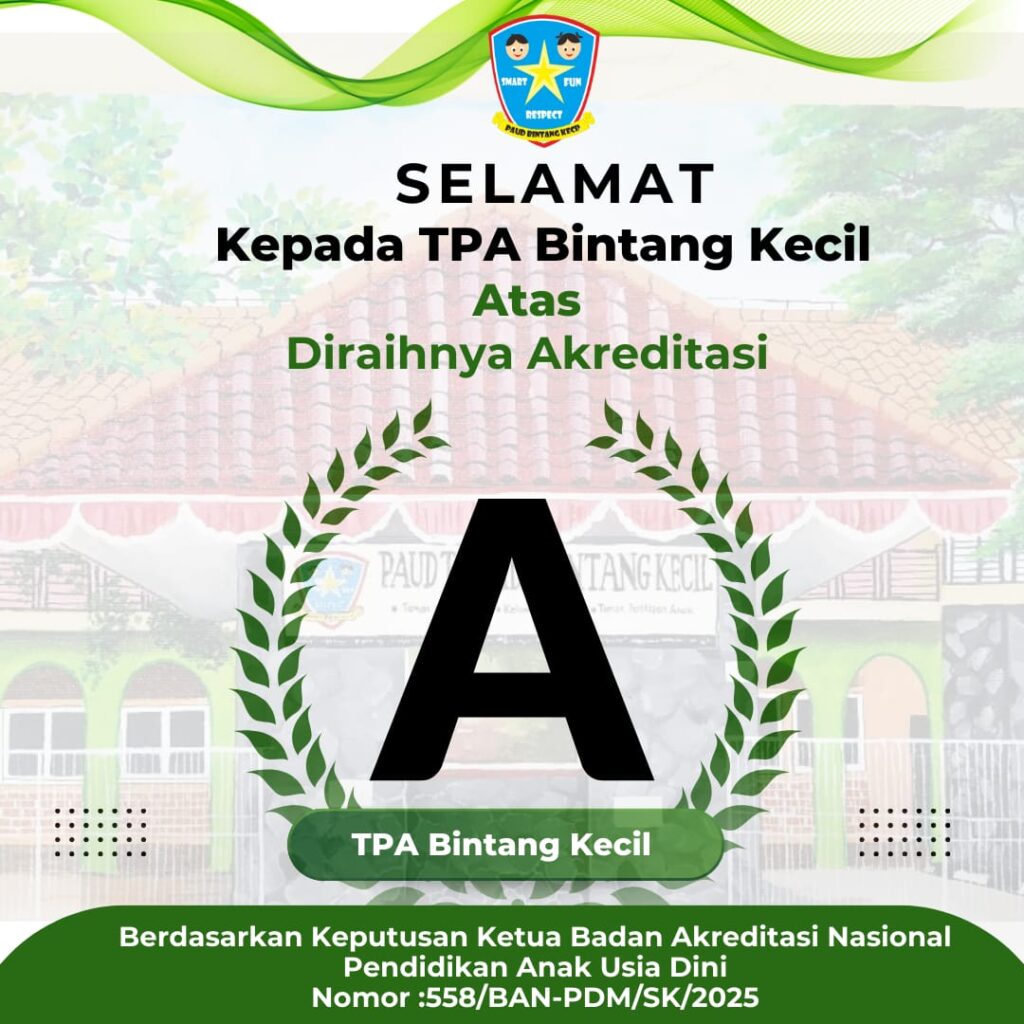 Dan tidak terasa TPA Bintang Kecil sudah melayani masyarakat selama 9 Tahun. Pada bulan Agustus 2025 TPA Bintang Kecil mengikuti Akreditasi dari Badan Akreditasi Nasional Pendidikan Dasar dan Menengah (BAN PDM) Provinsi Jawa Tengah dan mendapatkan NILAI A. Semoga dengan terakreditasi A kami bisa mempertahankan layanan kami. Terima kasih untuk masyarakat yang sudah mempercayakan putra/ putrinya di TPA Bintang Kecil. Semoga layanan TPA Bintang Kecil semakin berkualitas dan eksis di tahun-tahun selanjutnya.